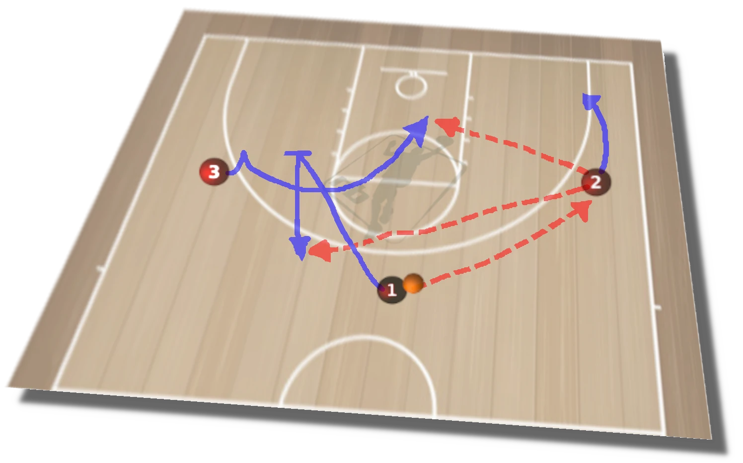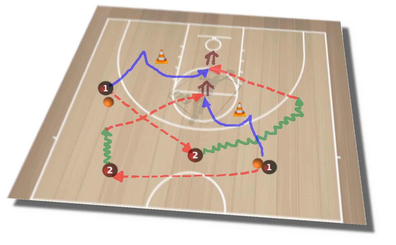 Teniendo controlados todos los detalles enunciados, es importante que en el trabajo no se deje al azar ningún aspecto. Ya se que es difícil, complicado y requiere un esfuerzo mental enorme, pero si alguien pretende convertirse en un buen entrenador no tendrá más remedio que pasar por ello. Hay que mejorar los conceptos pero sin olvidar la técnica, porque sin técnica ningún concepto funciona como debería. En el diagrama 1, por ejemplo, realizamos un ejercicio de mejora de la puerta atrás. ¿Sencillo? Claro, mientras se realice correctamente. Cuando (1) pasa a (2), éste se desplaza abriendo ángulo de pase y (1) sigue la trayectoria del balón pidiéndola con las manos. Esa es la finta, porque obliga al defensor a anticipar, y es cuando se corta por detrás. Es un ejercicio primario, pero una vez que los jugadores entiendan la dinámica, complicamos las cosas . Ponemos un defensor sobre (1), con lo cual obligamos al atacante a leer la posición defensiva para crearse el espacio suficiente para recibir. Seguidamente solo defendemos al pasador (2). Entonces empezamos a trabajar también como abrir el espacio y como movernos en timing con el compañero. Finalmente jugamos 2c2 poniendo en practica todos los recursos y los conceptos que queremos enseñar. Este ejercicio en mi equipo junior, tiene una secuencia de continuación. Cuando el atacante (1) recibe, obligamos a los defensores a realizar un 2c1 y al atacante sin balón moverse por el espacio para recibir un balón doblado y tirar. Mismo trabajo con la misma dinámica de ejecución si entrenamos cortes, diagrama 2. Importante trabajar aquí las fintas con el cuerpo cambiando los apoyos de los pies para engañar al defensor.