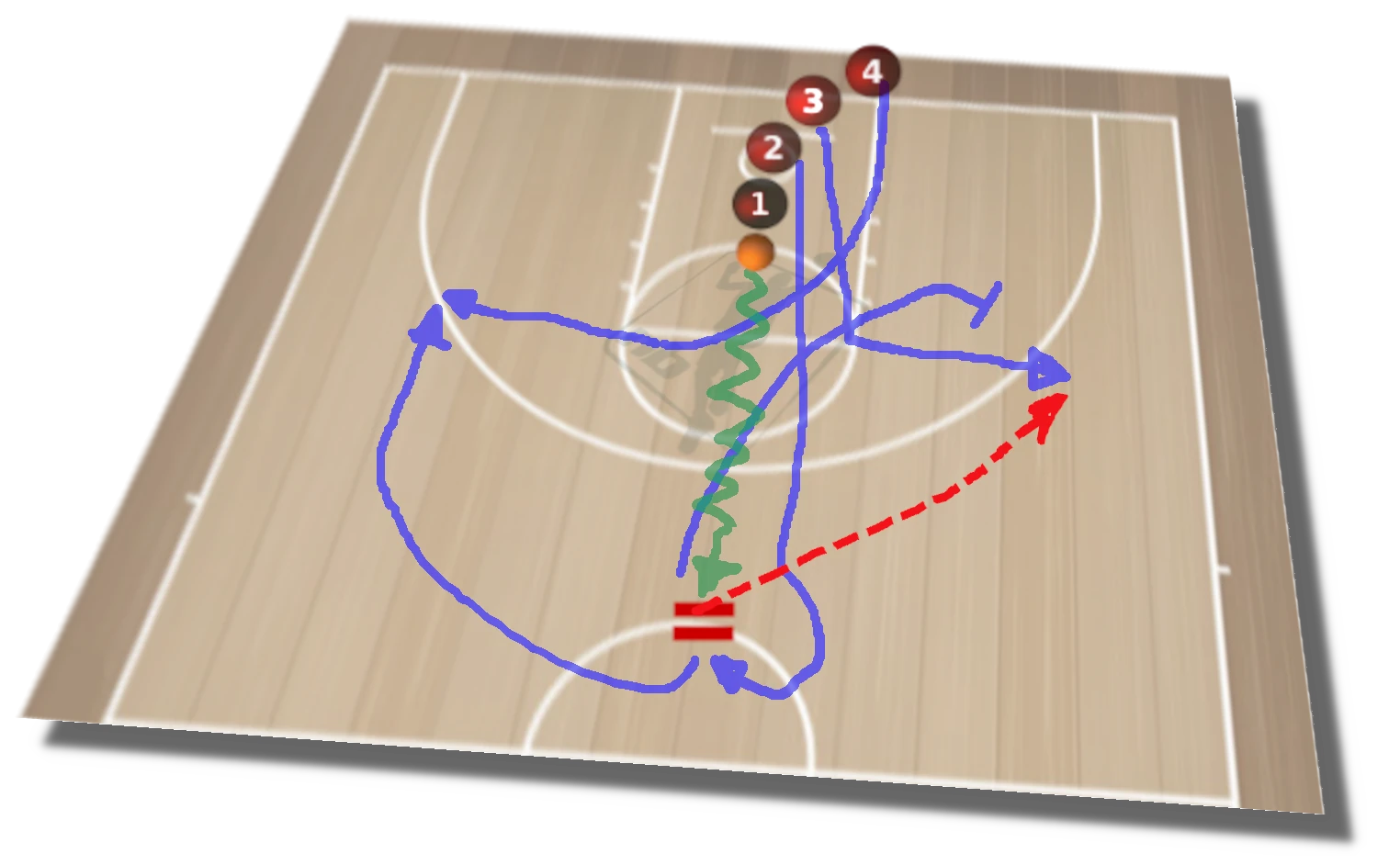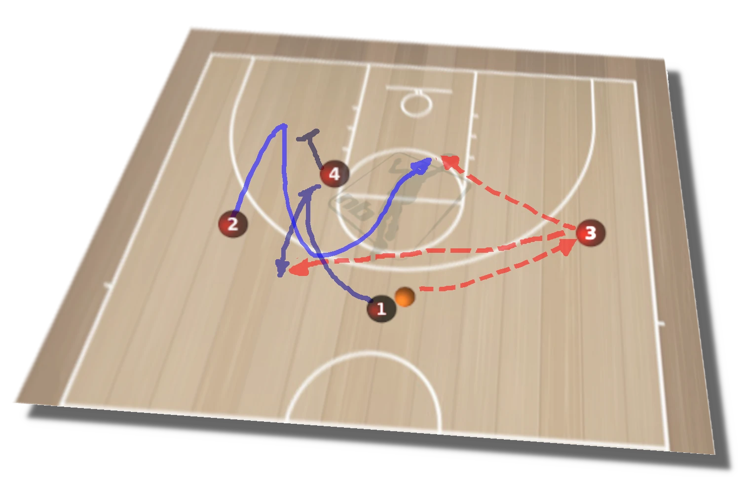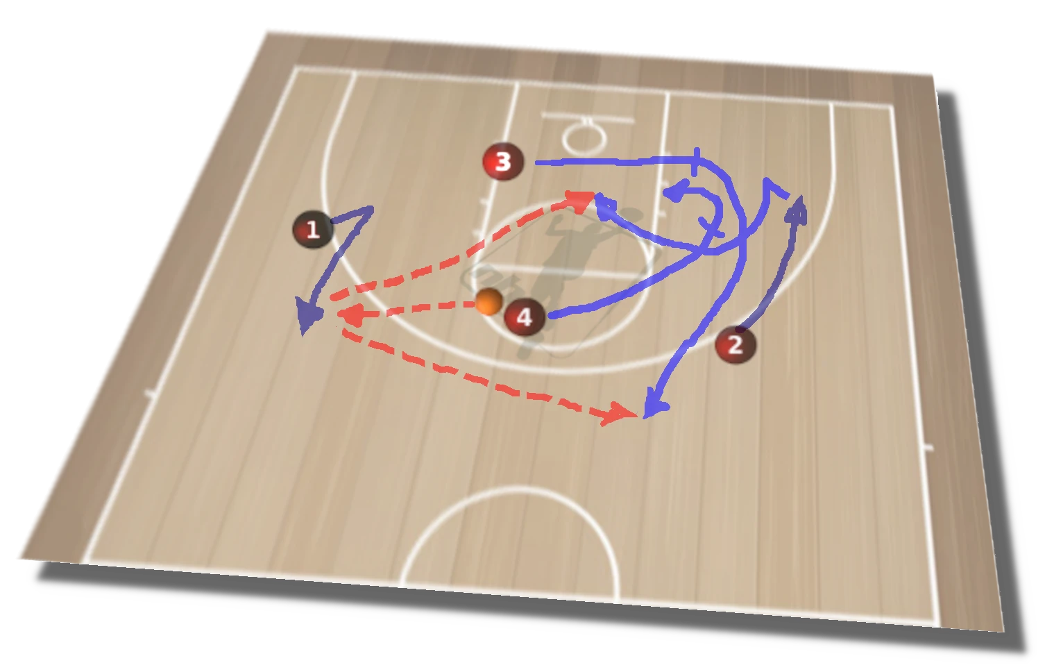 En el diagrama A2, doble opción con el bloqueo indirecto de (2) a (3), y (1) que juega PR o directamente interior para (4). Si el balón va hacia (2), diagrama A3,indirecto entre (3) y (4), Si no hay ventaja, cambiamos hacia (1), diagrama A4, y mantenemos la secuencia, con doble bloqueo para (2), con (3) que se abre frontalmente y (4) buscando ventaja interior.