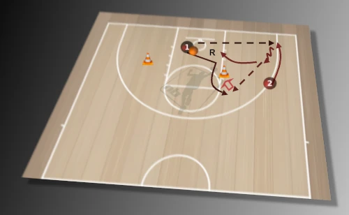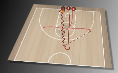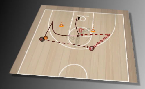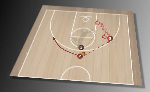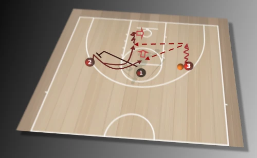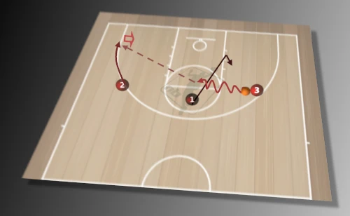 El jugador (1) sale botando hasta la línea de triple y el (2) le persigue hasta rodear a su compañero y recibir el balón mano a mano, mientras (3), llegado a la línea del tiro libre, se abre hacia uno de los laterales.