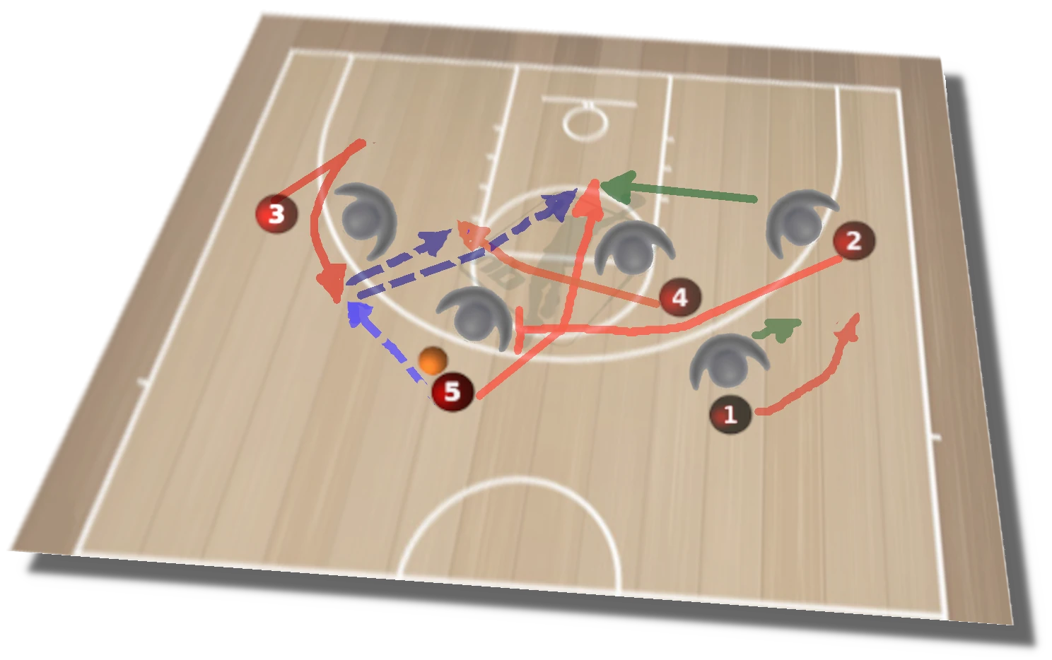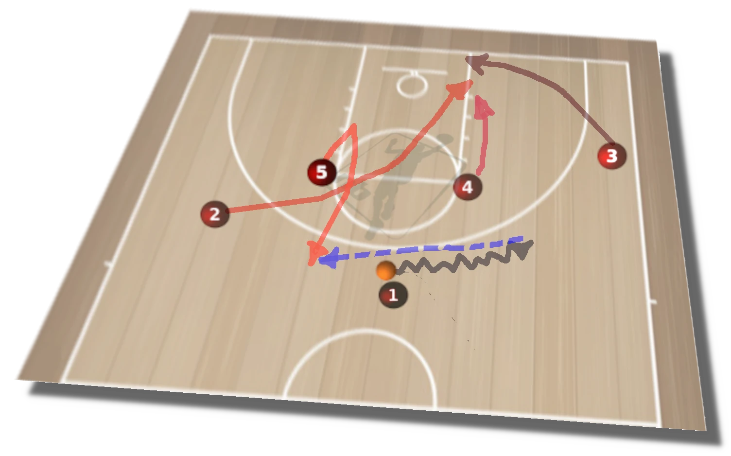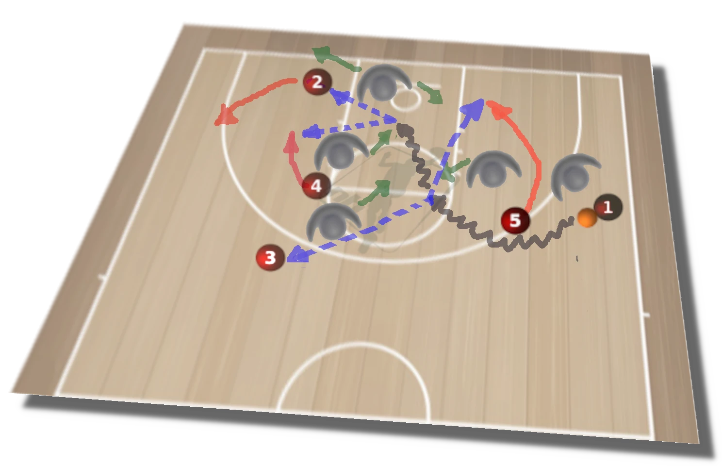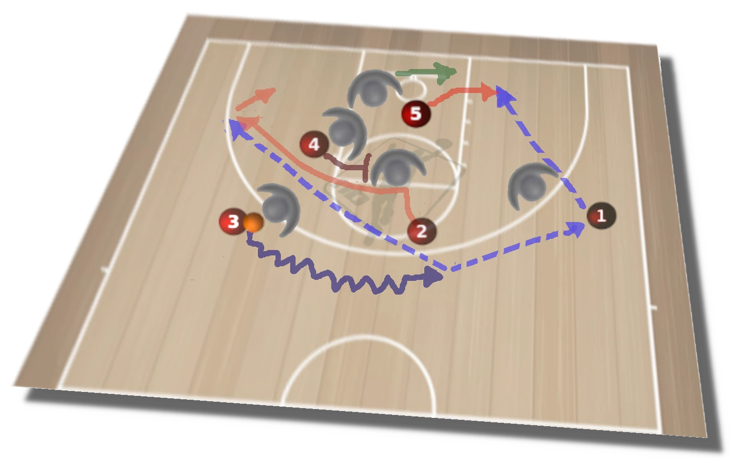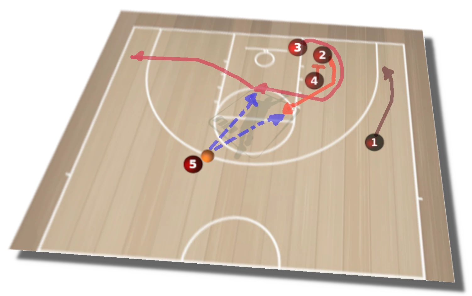 A partir de aquí, diagrama 4, la iniciativa la toma el base (1) en función de las ayudas, Si cierra el defensor de (5), éste continua hacia dentro para recibir en la continuación. Si ayuda el defensor de (3), (1) dobla para el tiro de (3). Si el base logra profundizar en la penetración y supera las primeras ayudas, habrá más opciones.