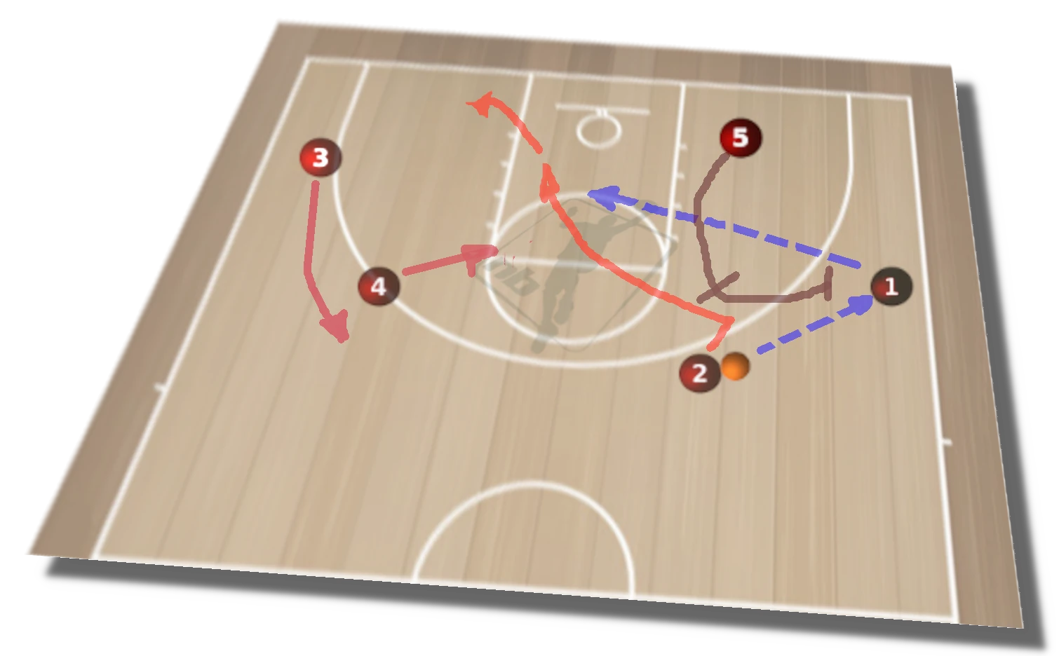 En la mayoría de equipos se suele tener un jugador más habilidoso que la media y que es capaz de sumar puntos con cierta frecuencia. Todos, o casi todos, los entrenadores intentamos crear situaciones para poner a este tipo de jugador en posición de ventaja respecto a la defensa para aprovechar sus habilidades. La idea básica es que a través de bloqueos en el juego sin balón se creen estas opciones. Por ejemplo, la idea es realizar un bloqueo ciego para despistar las ayudas y con un segundo bloqueo ciego dejar al mencionado jugador con el espacio suficiente para tomar la iniciativa con ventaja. En el diagrama 1, el juego empieza con el pase de (5) para (3). En este momento (2) va a realizar un bloqueo ciego al mismo (5) que corta interior, mientras (4) se cambia de lado. La primera opción que si (3) no puede tirar, intenta entrar el balón para (4) o (5). Si no hay nada de todo esto, y mientras (1) se aleja al lado contrario, (4) aprovecha la mala colocación de los defensores, que están ayudando en los cortes interiores, diagrama 2, para realizar un bloqueo ciego a (2), que se abre rápido al lateral y encara la canasta. Aquí es muy importante que (2) domine la técnica de giro del cuerpo para encarar rápido y coger la defensa en contrapié cuando recibe de (3). Éste también puede jugar para el 1c1 de (1), que a su vez puede jugar interior para el poste (5). ¿Sencillo? Claro, si además el (2) es Alan Iverson, pues todo resulta más fácil. Era uno de los juegos de los Sixers, y que sigue vigente. Todavía más sencilla la siguiente opción que se fundamenta en una buena lectura de las posiciones defensivas por parte del base atacante. En el diagrama 3, el movimiento lo empieza (2) pasando a (1) y cortando sobre el bloqueo ciego de (5) para intentar recibir dentro del área. Si no lo consigue, se abre al lado contrario. (5) continua y va a jugar pick and roll con (1), mientras (3) ocupa la posición frontal y (4) se acerca a la esquina superior del área.