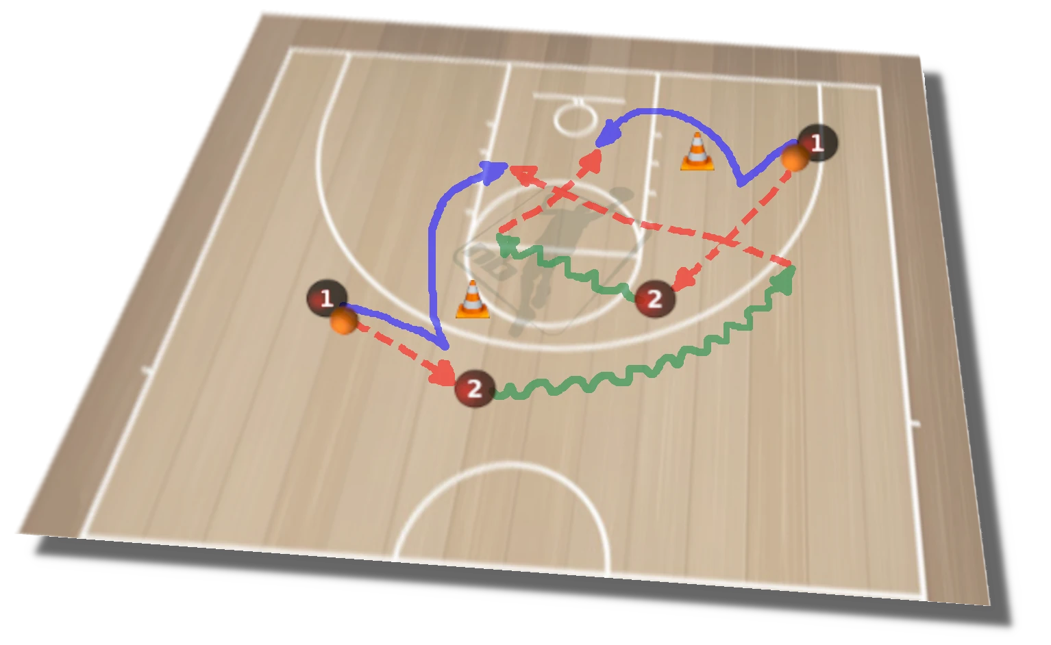Teniendo controlados todos los detalles enunciados, es importante que en el trabajo no se deje al azar ningún aspecto. Ya se que es difícil, complicado y requiere un esfuerzo mental enorme, pero si alguien pretende convertirse en un buen entrenador no tendrá más remedio que pasar por ello. Hay que mejorar los conceptos pero sin olvidar la técnica, porque sin técnica ningún concepto funciona como debería. En el diagrama 1, por ejemplo, realizamos un ejercicio de mejora de la puerta atrás. ¿Sencillo? Claro, mientras se realice correctamente. Cuando (1) pasa a (2), éste se desplaza abriendo ángulo de pase y (1) sigue la trayectoria del balón pidiéndola con las manos. Esa es la finta, porque obliga al defensor a anticipar, y es cuando se corta por detrás. Es un ejercicio primario, pero una vez que los jugadores entiendan la dinámica, complicamos las cosas . Ponemos un defensor sobre (1), con lo cual obligamos al atacante a leer la posición defensiva para crearse el espacio suficiente para recibir. Seguidamente solo defendemos al pasador (2). Entonces empezamos a trabajar también como abrir el espacio y como movernos en timing con el compañero. Finalmente jugamos 2c2 poniendo en practica todos los recursos y los conceptos que queremos enseñar. Este ejercicio en mi equipo junior, tiene una secuencia de continuación. Cuando el atacante (1) recibe, obligamos a los defensores a realizar un 2c1 y al atacante sin balón moverse por el espacio para recibir un balón doblado y tirar. Mismo trabajo con la misma dinámica de ejecución si entrenamos cortes, diagrama 2. Importante trabajar aquí las fintas con el cuerpo cambiando los apoyos de los pies para engañar al defensor.