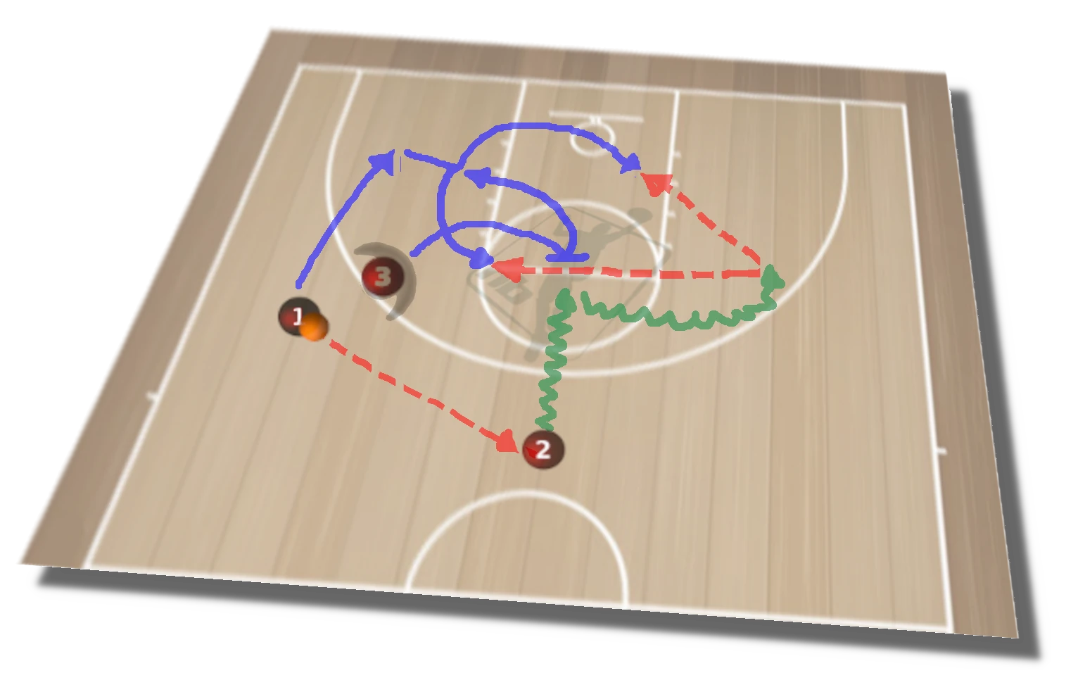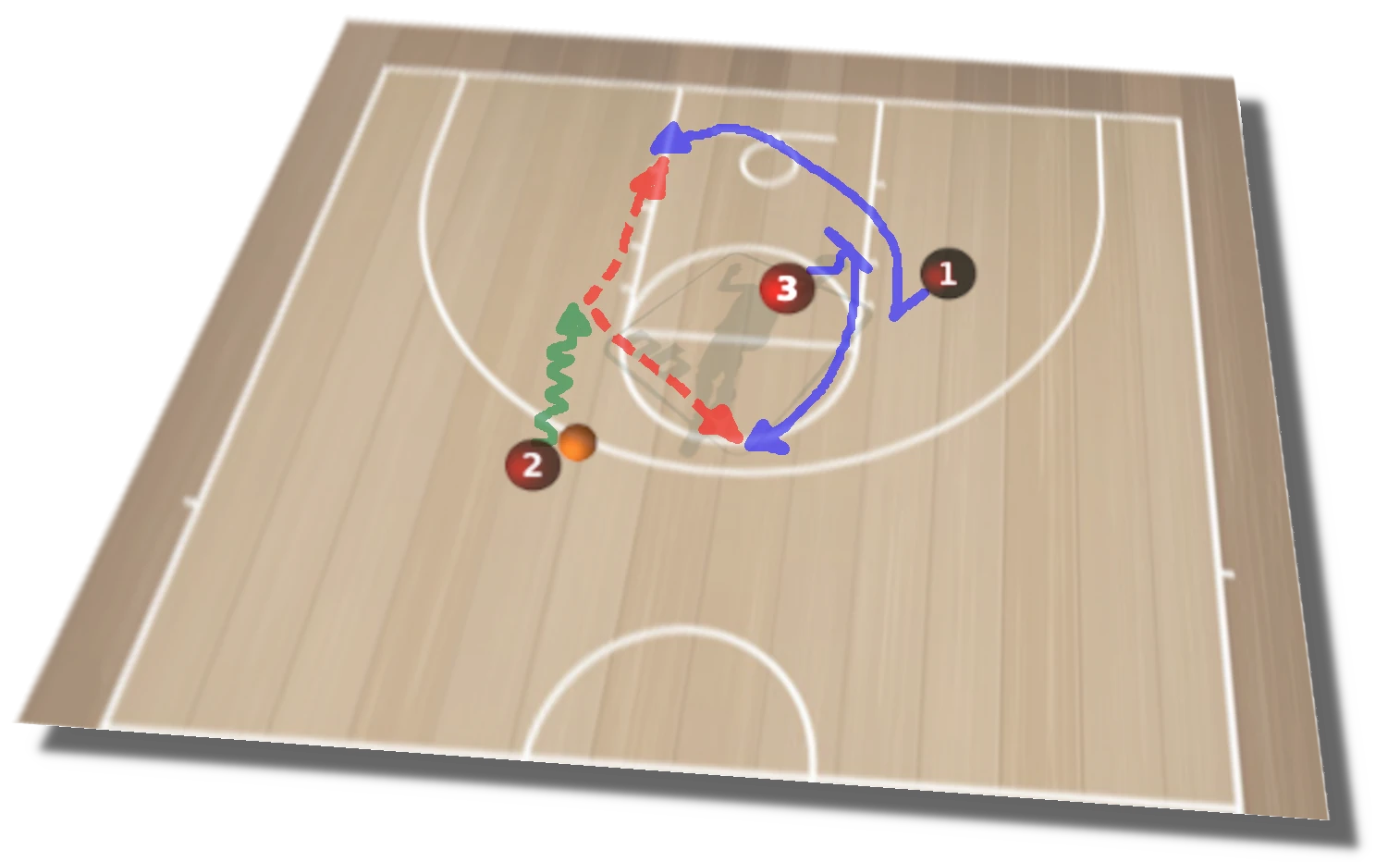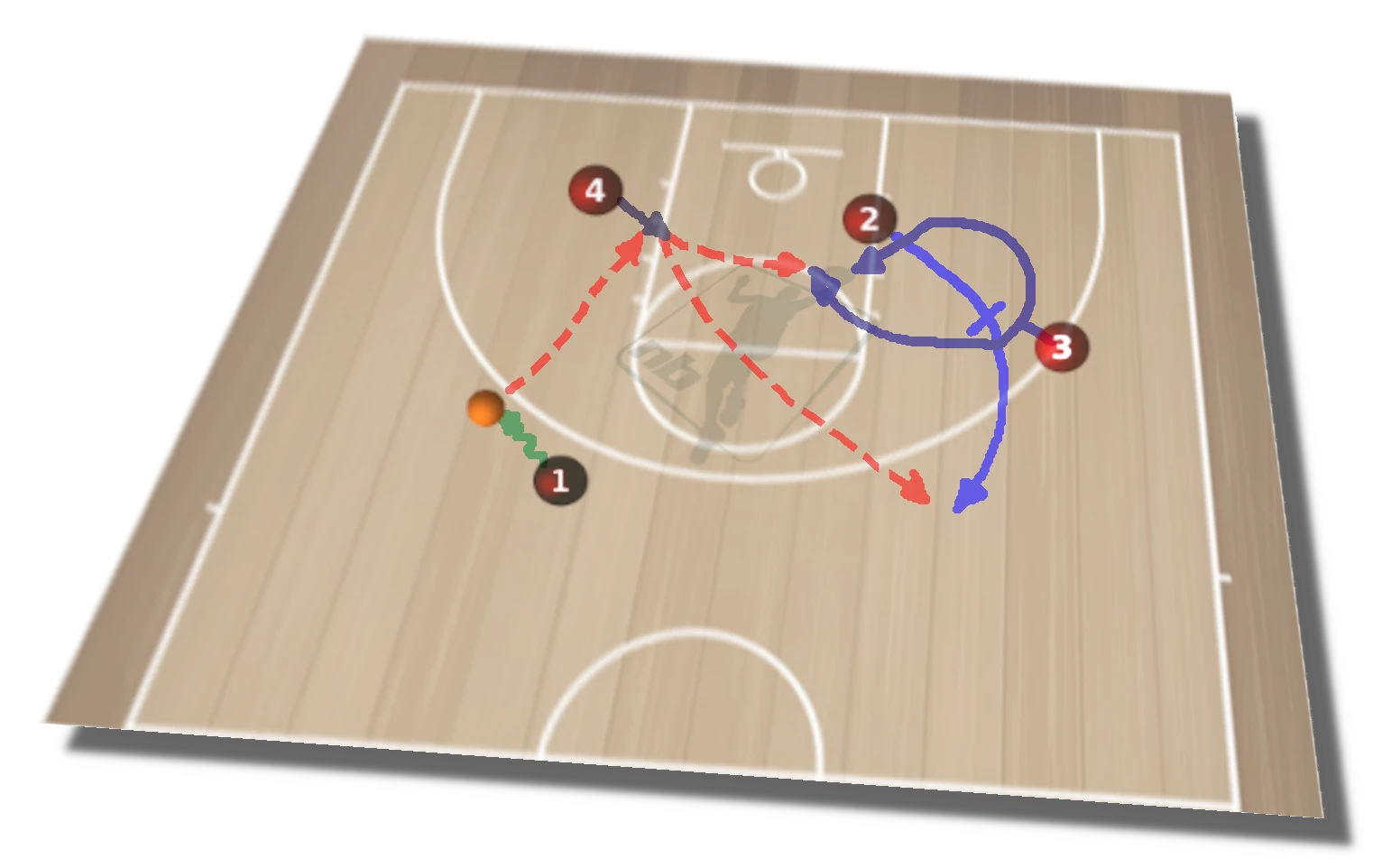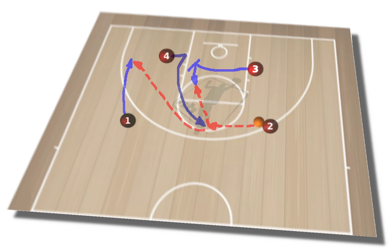 En el diagrama A2, doble opción con el bloqueo indirecto de (2) a (3), y (1) que juega PR o directamente interior para (4). Si el balón va hacia (2), diagrama A3,indirecto entre (3) y (4), Si no hay ventaja, cambiamos hacia (1), diagrama A4, y mantenemos la secuencia, con doble bloqueo para (2), con (3) que se abre frontalmente y (4) buscando ventaja interior.